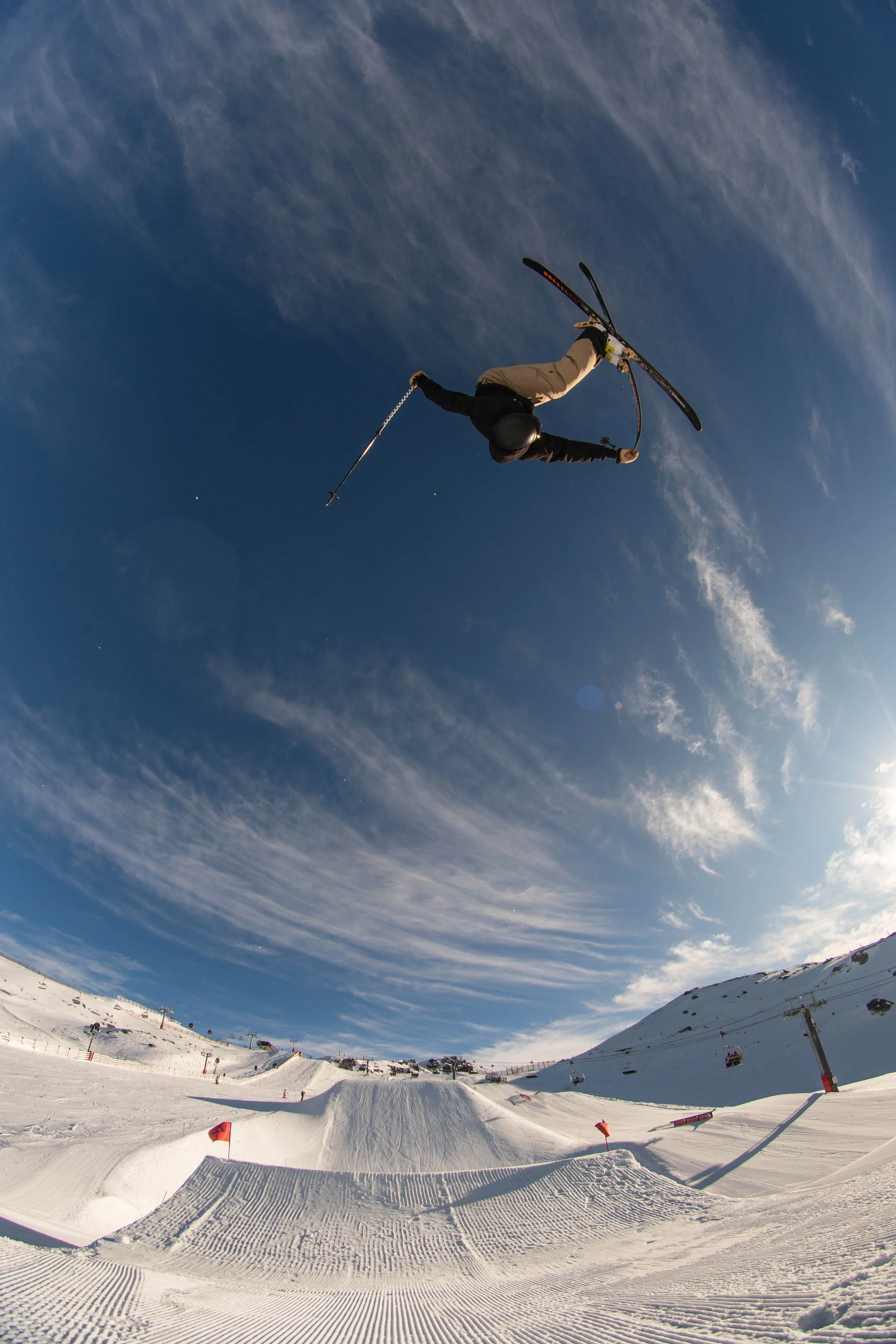 A skier performing an upside-down jump on a snowy slope against a bright sun and blue sky in a ski resort.