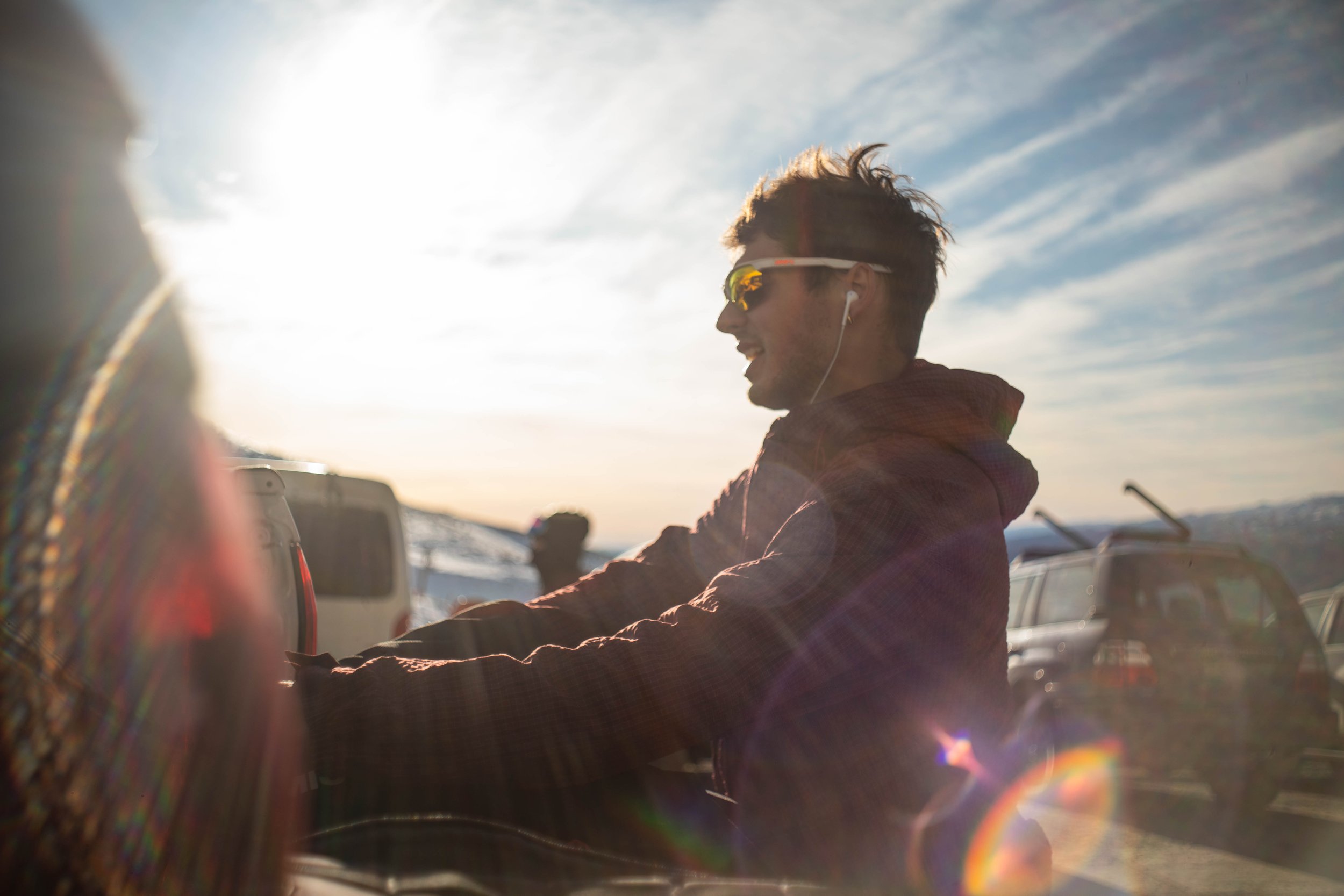 A person dressed in a purple ski jacket, black beanie with a Monster Energy logo, pink ski goggles, and brown gloves stands in a snowy landscape, looking down while snow falls around.